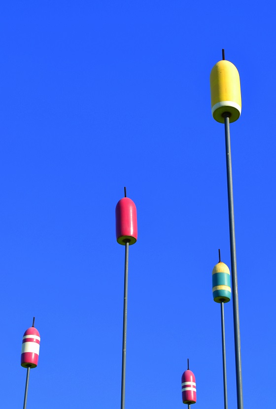 Buoys artfully adorning the path leading to the harbor.