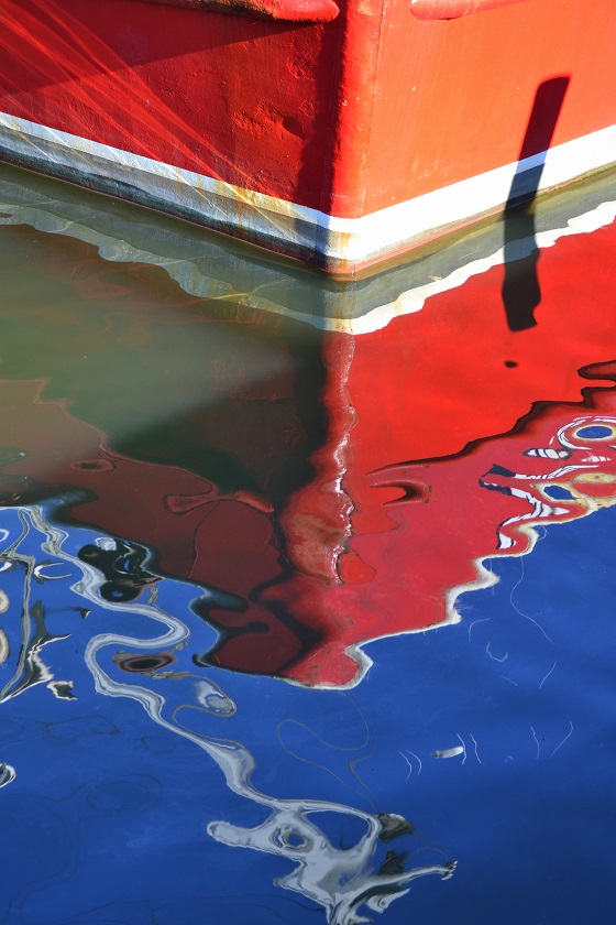 A trawler’s bow reflecting off the water.